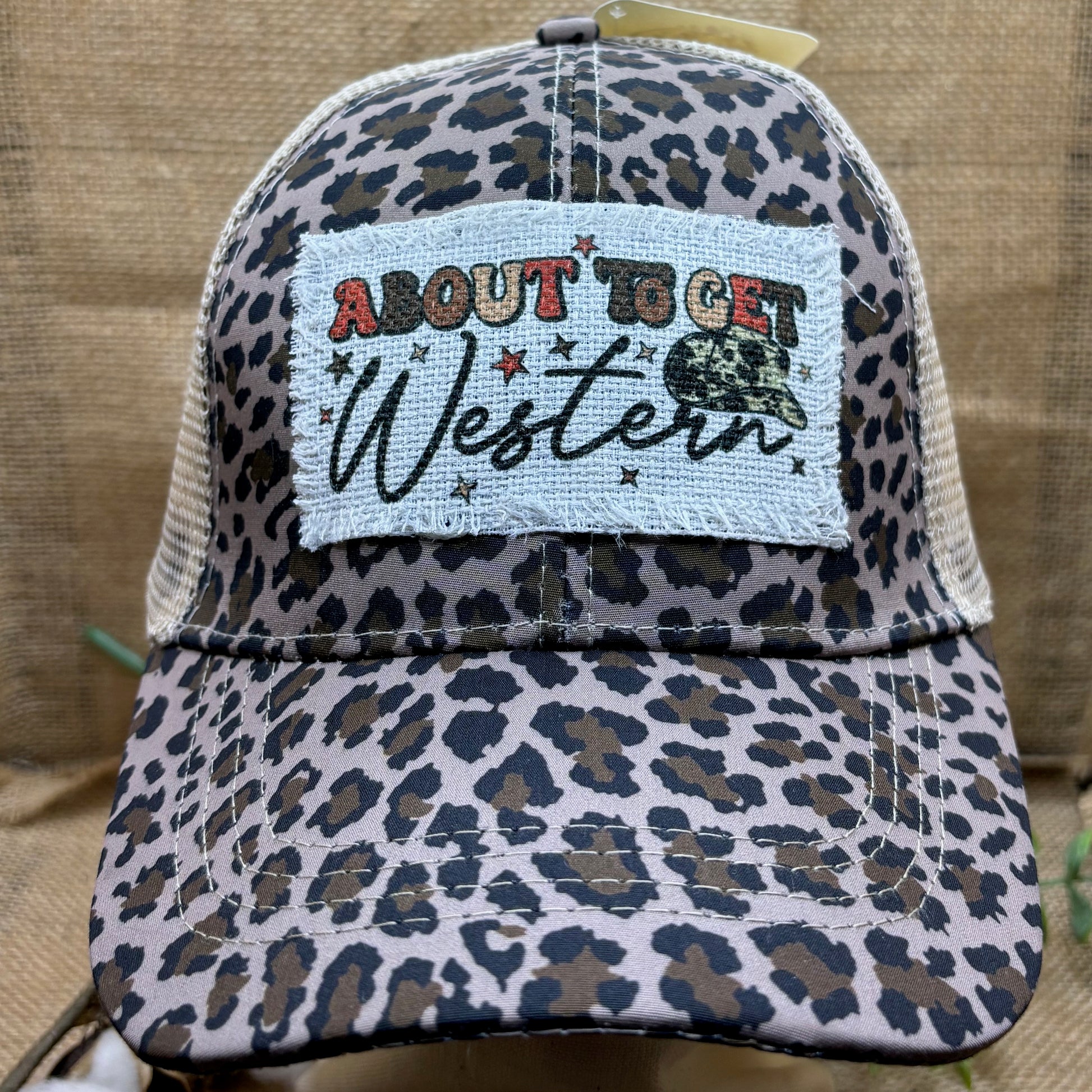 About To Get Western Trucker Distressed Patch Ponytail Hat