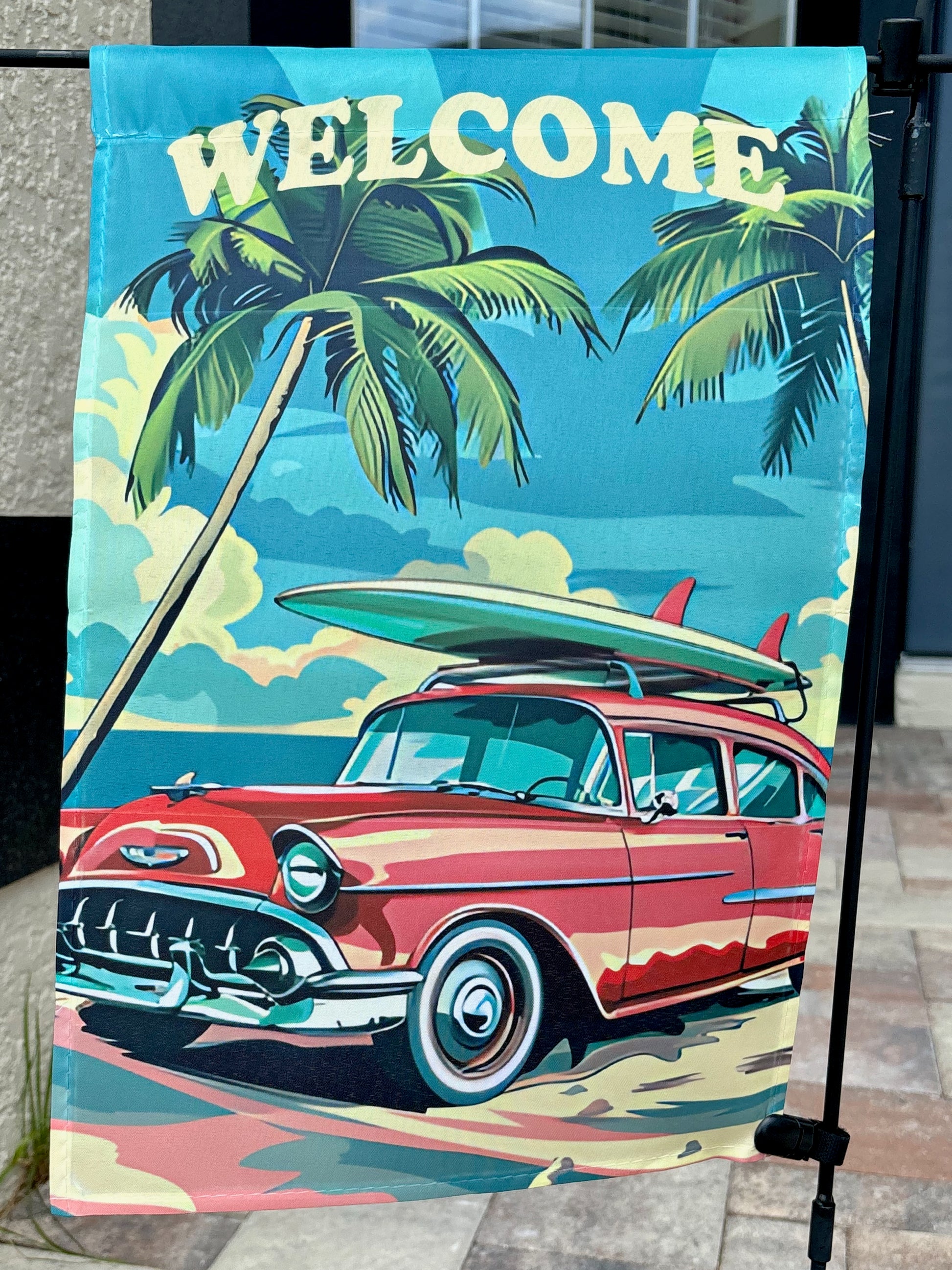 Retro Car & Surfboard Beach Summer Welcome Flag